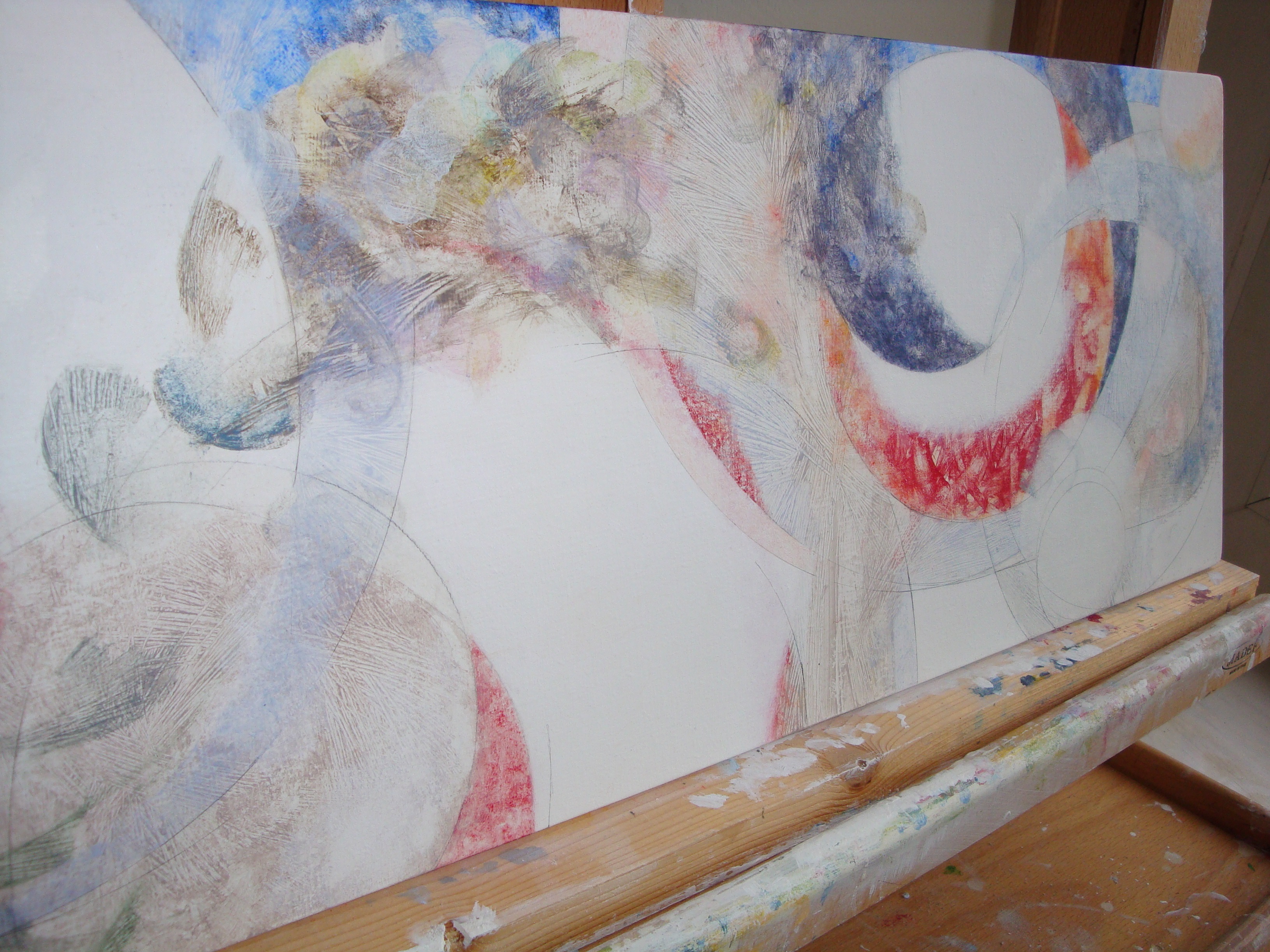 In principe heb ik de schurft aan het woord materialistisch. Als beeldend kunstenaar, ben ik in wezen ook een materialist. Ik werk met materie, ik ben zintuiglijk en hoewel ik de afgelopen twee jaar ontzettend veel spullen heb weggedaan, heb ik nog steeds een verkleedkast vol kleurrijke kleren waar ik veel plezier aan beleef. Fluweel, suède, zijde en kant; verf, water, lijm en zand. Materialistisch is zo’n moralistisch woord. Waarom zou een vrouw die God achterna loopt dat niet mogen doen op rode suède schoentjes? (zie Hildegard van Bingen).